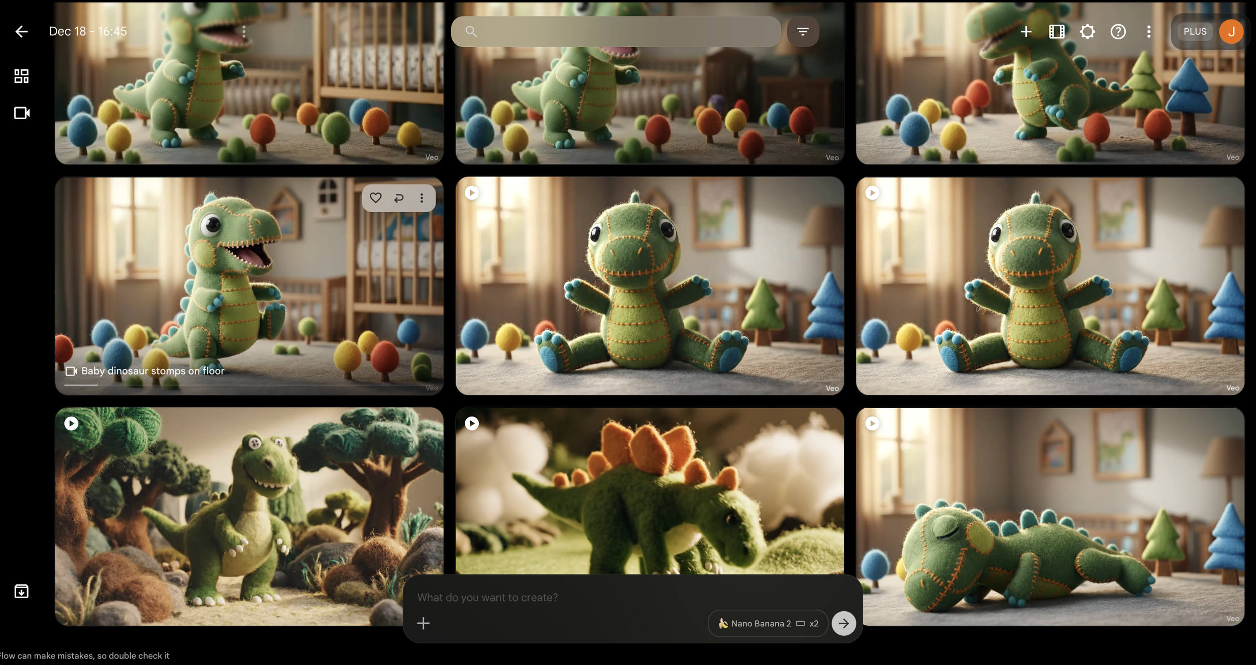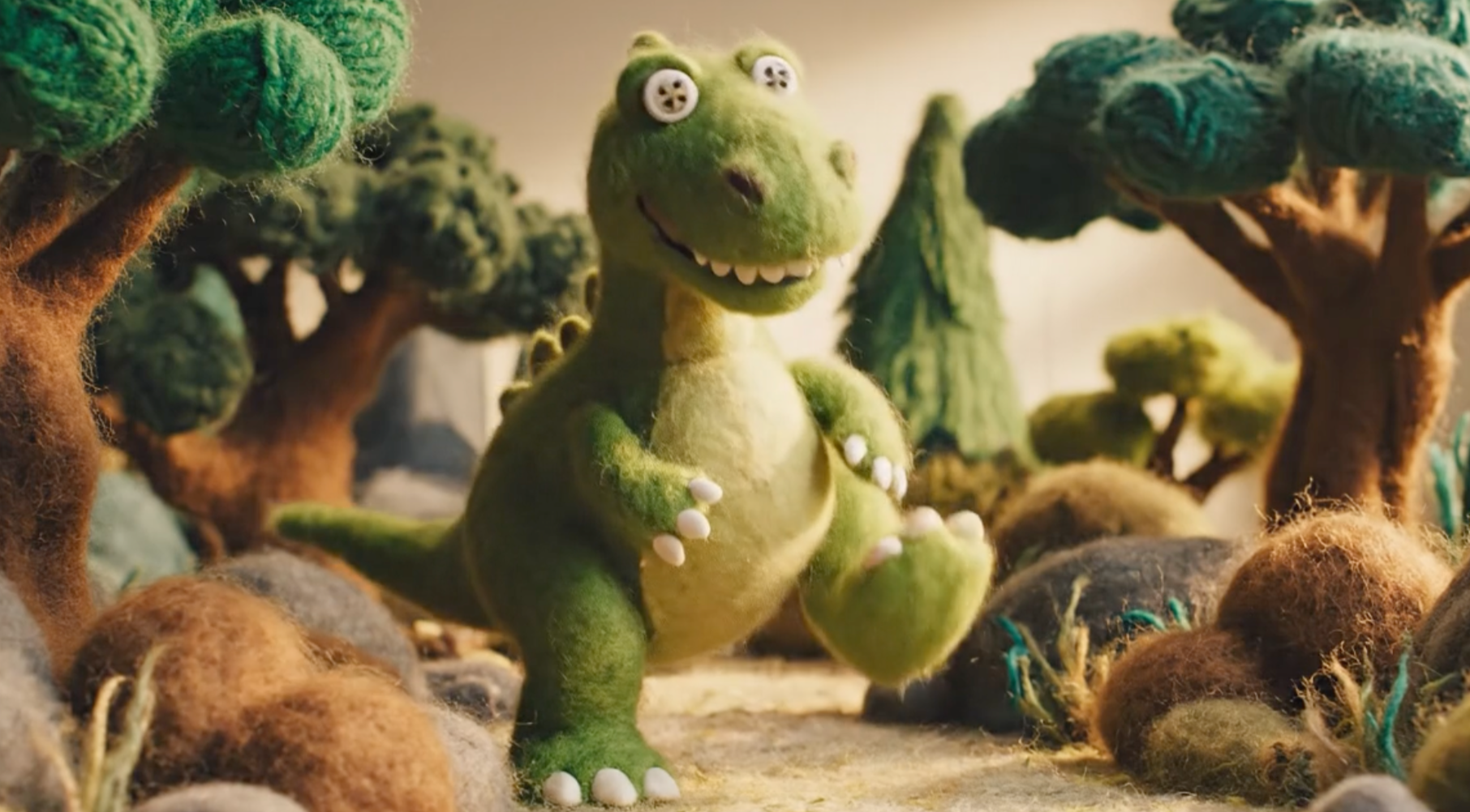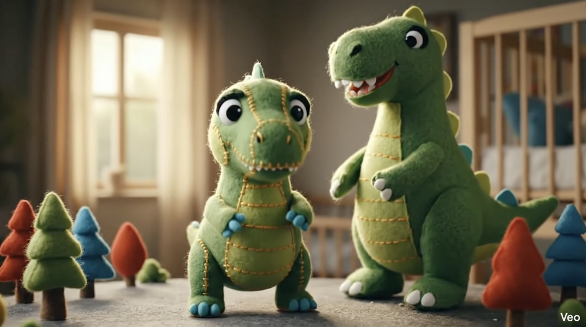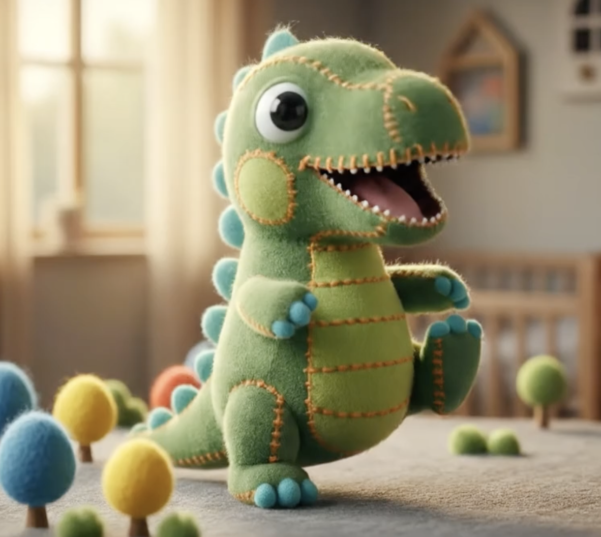 Then, I shifted my workflow to create a character. I wanted to use a popular animal among boys, so I picked a dinosaur. I wanted the character's texture to have a soft feel, so I prompted for a felt look with contrasting stitching. Initially, it generated a dinosaur with sewn-on button eyes, which looked a bit scary.